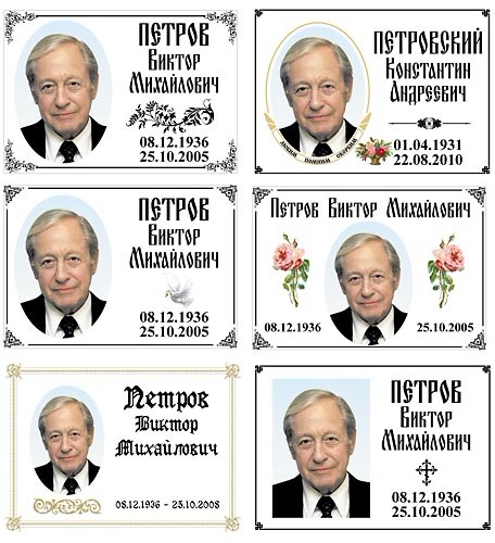 Изготовление различных табличек возможно на подложке из эмалированного металла. Они могут быть без отверстий (для крепления на памятник), а также иметь отверстия по горизонтали либо по вертикали (для крепления на крест).